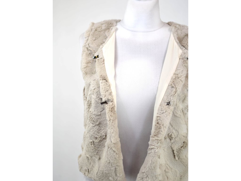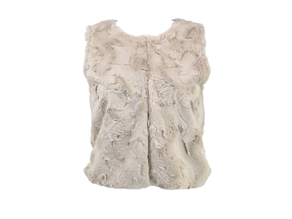 Dámská krátká vestička volnějšího rovného střihu. Vepředu má 2 místa na zapínání, která jsou řešena malou kovovou sponou a očkem. Svrchní vrstva je tvořena velice příjemným měkkým kožíškem, zevnitř s hladkou podšívkou. Hodí se skvěle jak ke kalhotám, tak sukním.