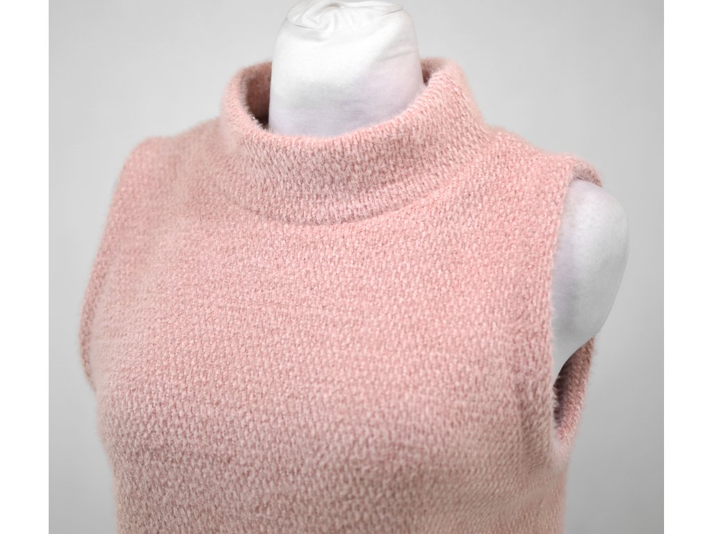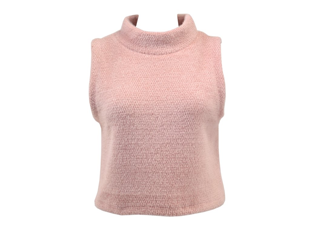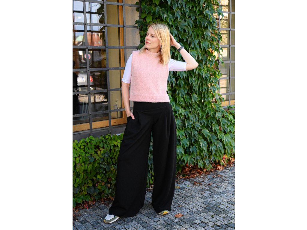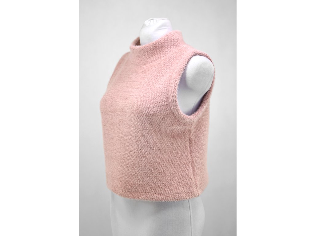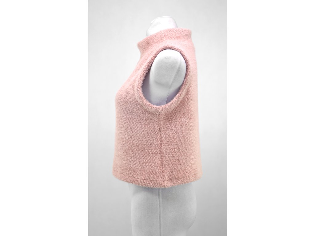 Dámská krátká vestička volnějšího rovného střihu. Průramky jsou dostatečně podstřižené a začištěné podsádkou. Střih je dostatečně volný, aby byl vhodný k vrstvení. Nízký stojáček je dostatečně široký i ke kombinaci s roláky. Hodí se skvěle jak ke kalhotám, tak sukním.