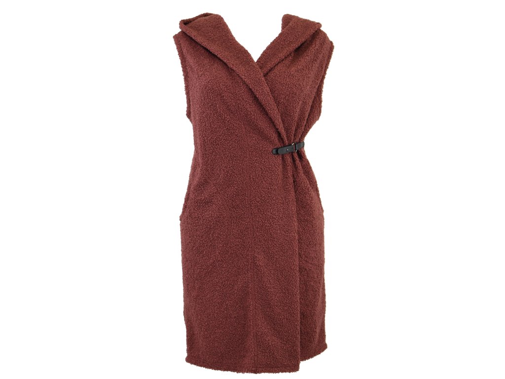 Dámská vesta rovnějšího střihu se zapínám v pase na levé straně. Zapínání má 2 dírky. Přední díl má dvojité klopy, které postupně přechází do kapuce. Není vypodšívkovaná. Samozřejmostí jsou kapsy v bocích. Může se nosit jako svrchní verze pro teplejší dny anebo jako spodní vrstva v mrazech.