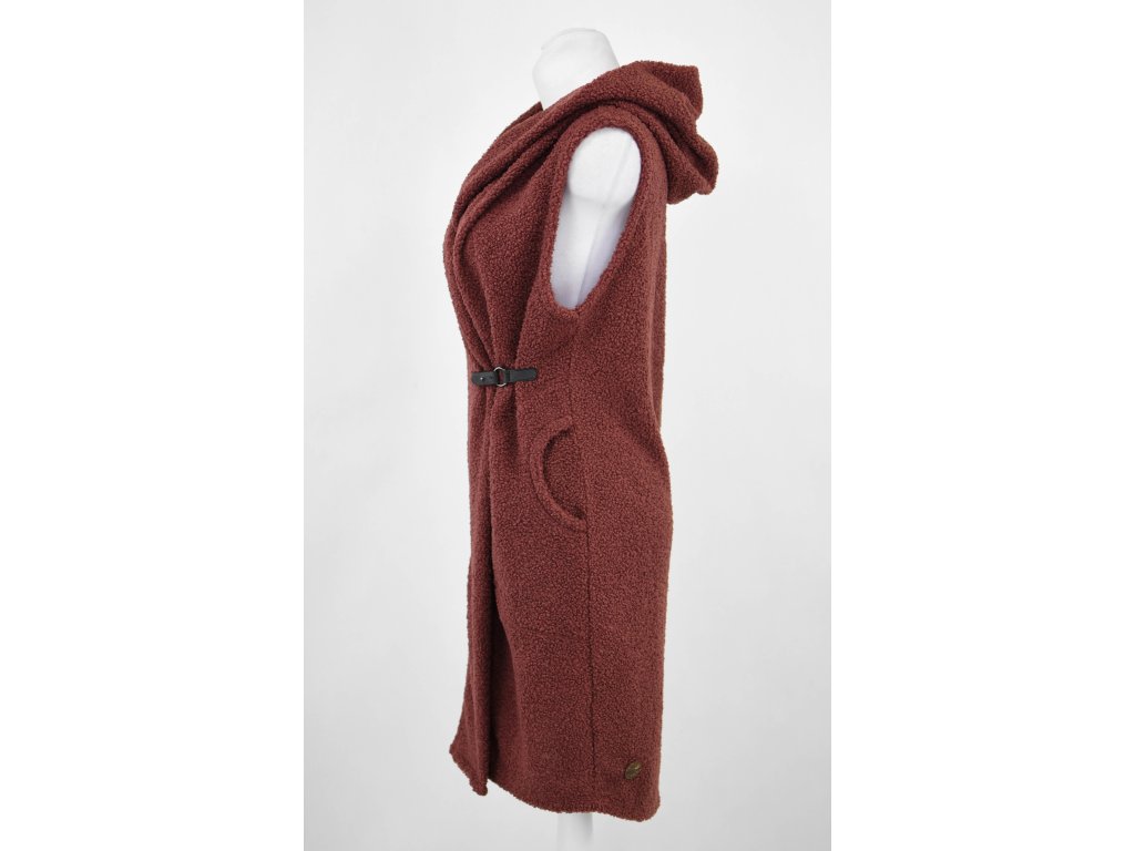 Dámská vesta rovnějšího střihu se zapínám v pase na levé straně. Zapínání má 2 dírky. Přední díl má dvojité klopy, které postupně přechází do kapuce. Není vypodšívkovaná. Samozřejmostí jsou kapsy v bocích. Může se nosit jako svrchní verze pro teplejší dny anebo jako spodní vrstva v mrazech.