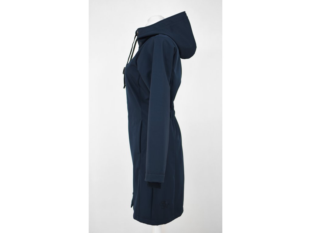 Dámský kabátek rovnějšího prodlouženého střihu s projmutým pasem, který hlavně tvaruje napevno všitá guma na zádech ve středu zadního dílu. Záda jsou nepatrně delší než přední část, spodek zadního dílu se lehce rozšiřuje a dolní lem je dokulata. Kapsy na zip jsou všité na předním díle. Kabát je bez podšívky, z rubu je slabší fleece. Zip je oboucestný a je u límce oddělen chráničem brady.