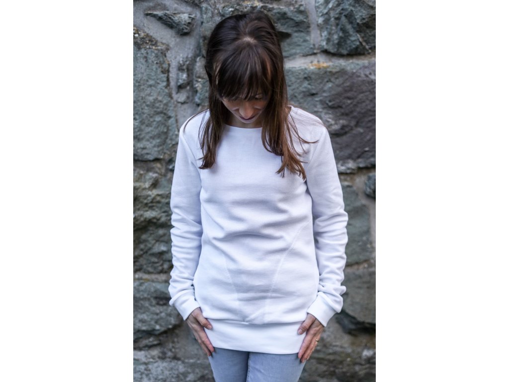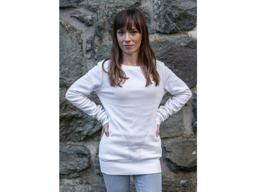 Dámská mikina prodloužené délky a s prodlouženými rukávy. Rovnější v pase, kapsy v bocích, průkrčník jsou lemované úpletem a taktéž rukávy.