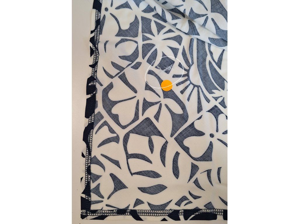 II.JAKOST = kaz v látce, zatržená a zašmodrchaná nitka v látce, u spodního okraje/cípu, na vrchní vrstvě, kterou si zavinete jako druhou