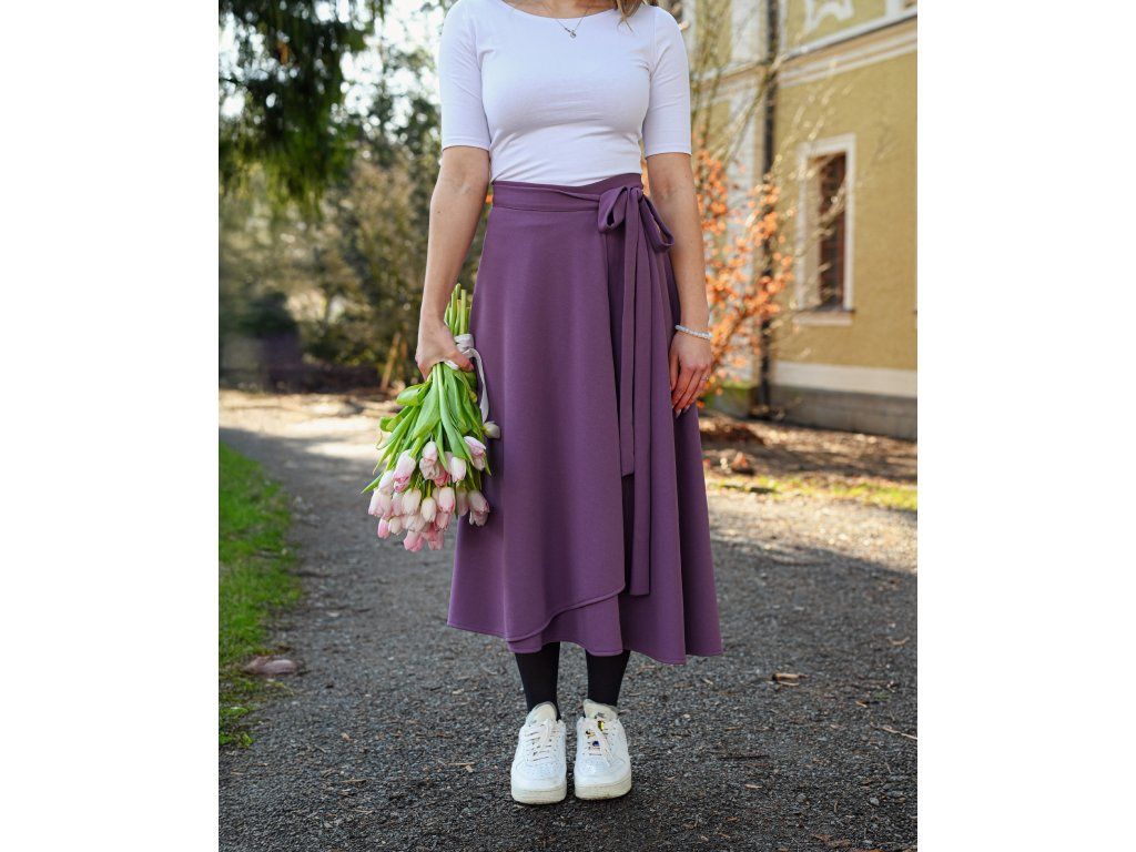 Zavinovací sukně je ušita z několika metrů látky, kterou si páskem zavinete kolem těla (na pravém boku je otvor, kterým protáhnete pásek). Vzadu je delší a vepředu kratší a asymetrická. Samotný střih sukně vychází z půlkolového tvaru. V bocích má skryté kapsy - ty jsou dobrým ukazatelem, že máte sukni správně posazenou.
