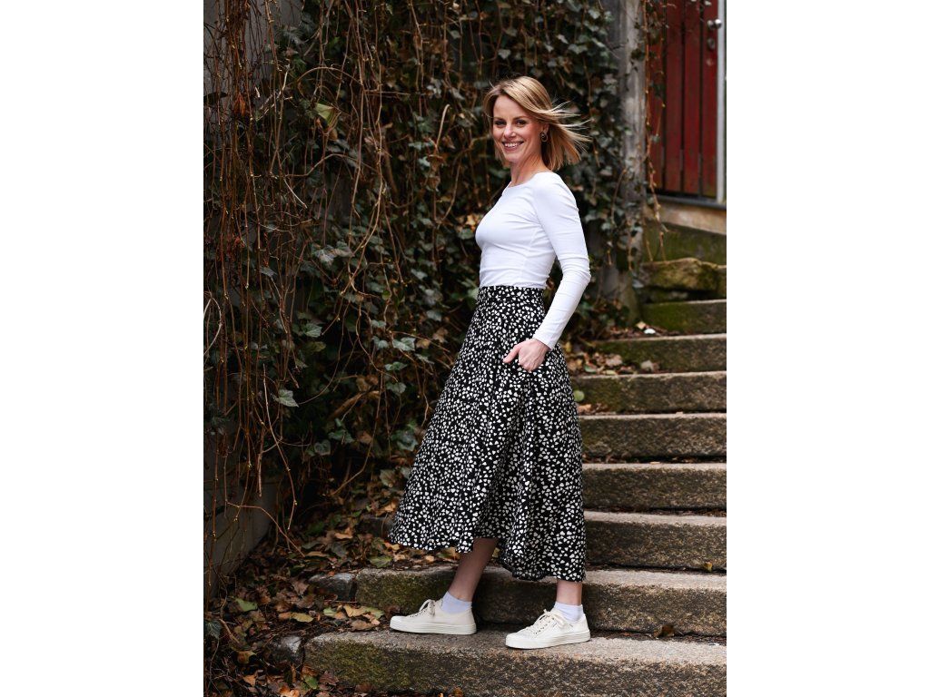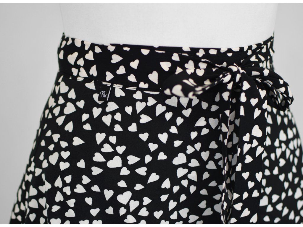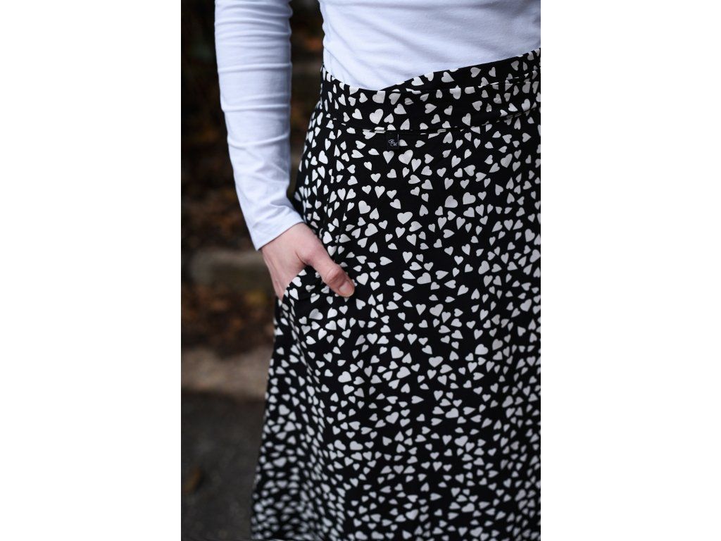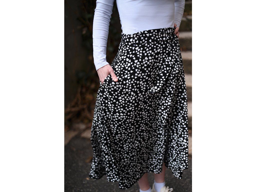 Zavinovací sukně je ušita z několika metrů látky, kterou si páskem zavinete kolem těla (na pravém boku je otvor, kterým protáhnete pásek). Vzadu je delší a vepředu kratší a asymetrická. Samotný střih sukně vychází z půlkolového tvaru. V bocích má skryté kapsy - ty jsou dobrým ukazatelem, že máte sukni správně posazenou.