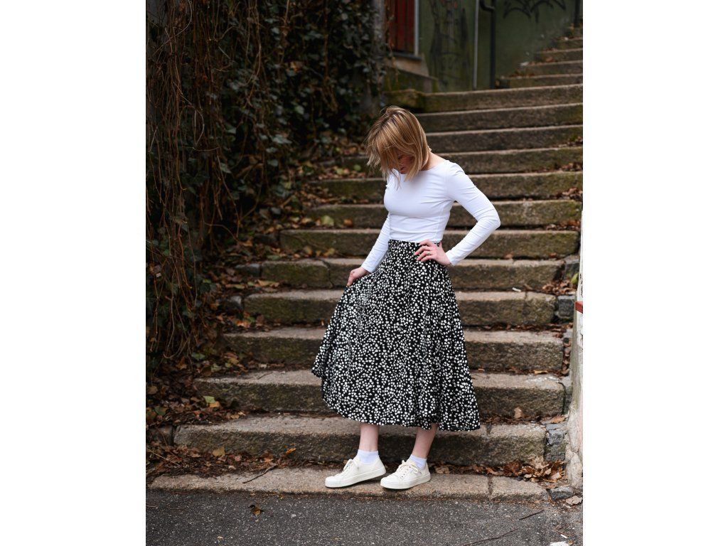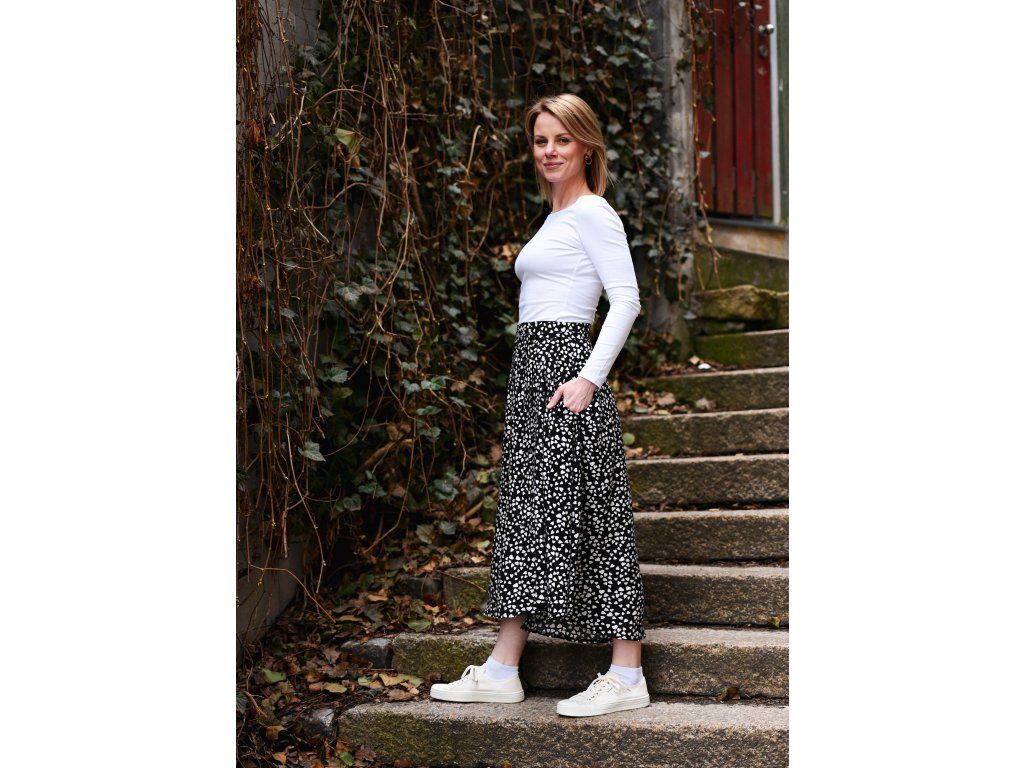Sukně se dá nosit výš v pase i níže na bocích, vše záleží na výběru vhodné velikosti a na stažení.