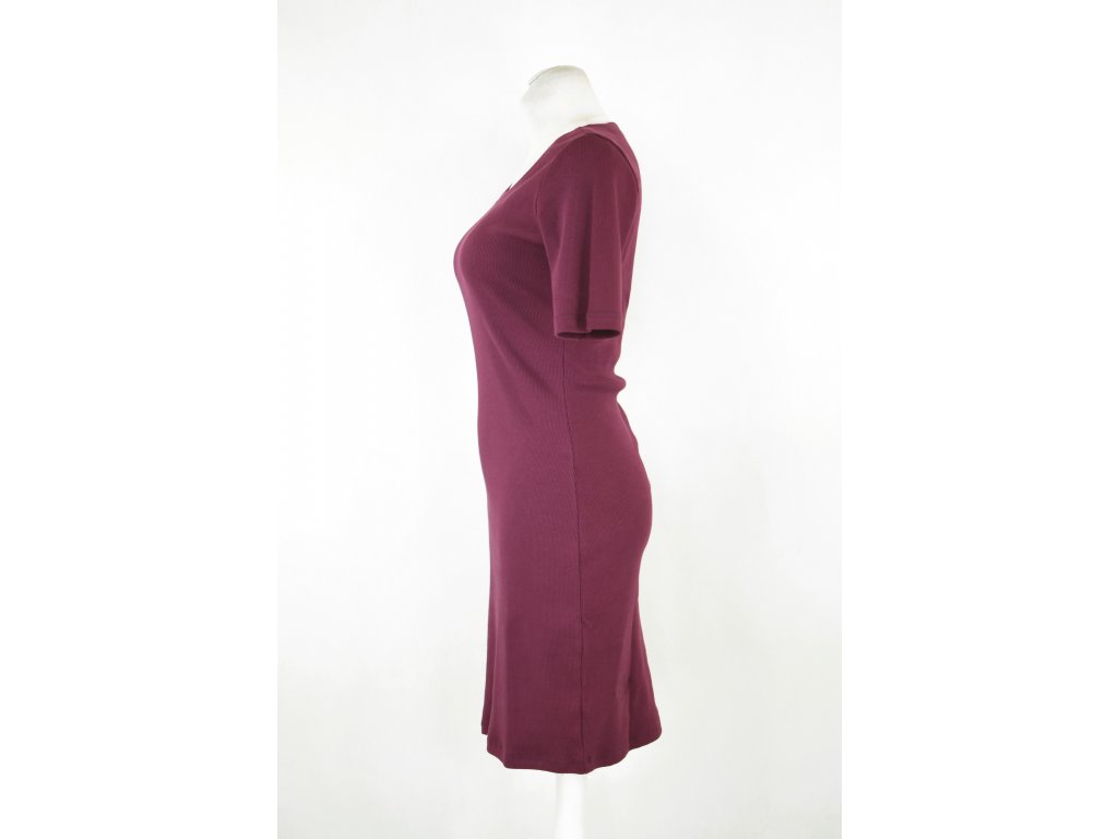 Dámské šaty z elastického žebrovaného úpletu. V pase projmuté, kulatý výstřih. Rukávy jsou delší než klasické krátké, ale stále nad loket.
