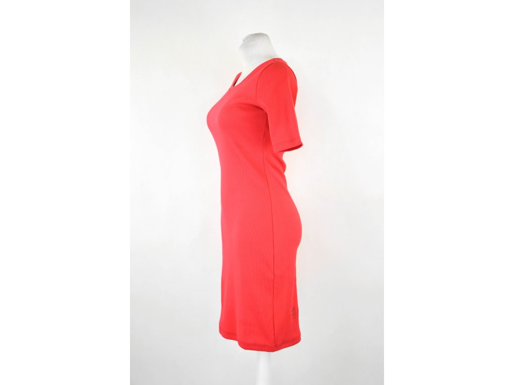 Dámské šaty z elastického žebrovaného úpletu. V pase projmuté, kulatý výstřih. Rukávy jsou delší než klasické krátké, ale stále nad loket.