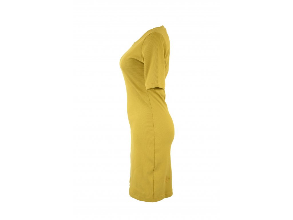 Dámské šaty z elastického žebrovaného úpletu. V pase projmuté, kulatý výstřih. Rukávy jsou delší než klasické krátké, ale stále nad loket.