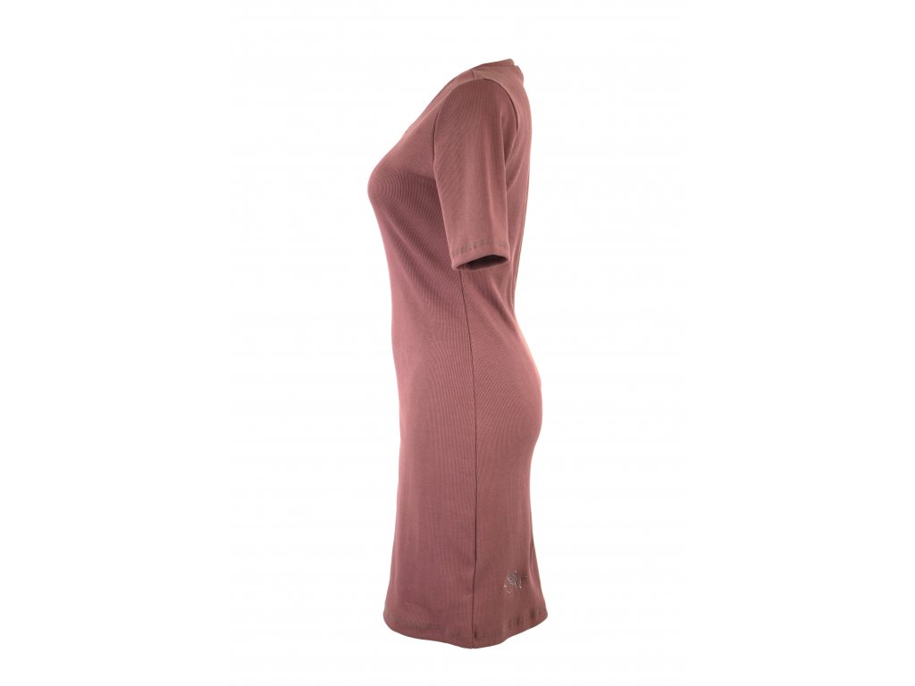 Dámské šaty z elastického žebrovaného úpletu. V pase projmuté, kulatý výstřih. Rukávy jsou delší než klasické krátké, ale stále nad loket.